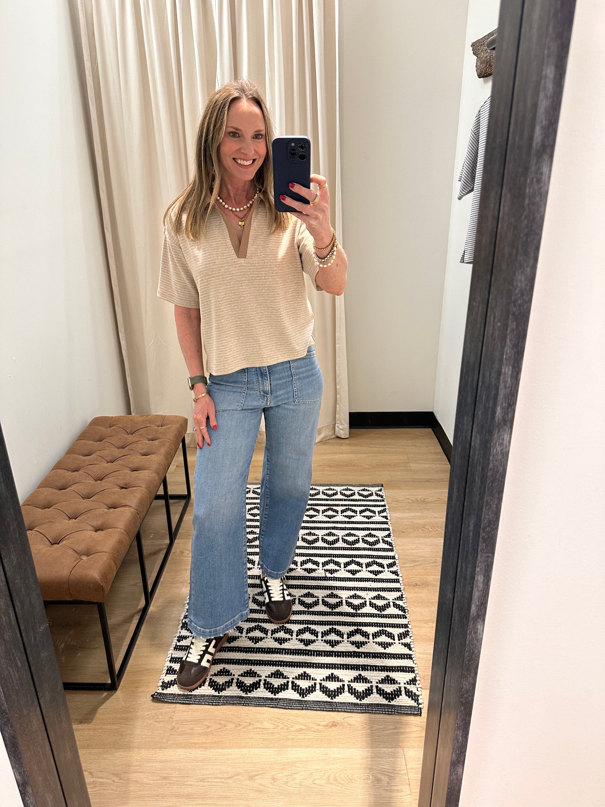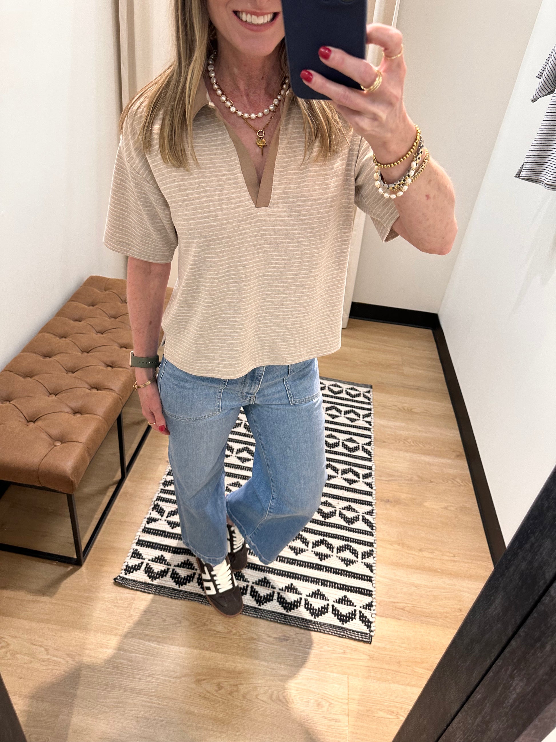 Made in our incredibly soft dream knit fabric, this tee is featured with a collared v-neckline and longer short sleeve.