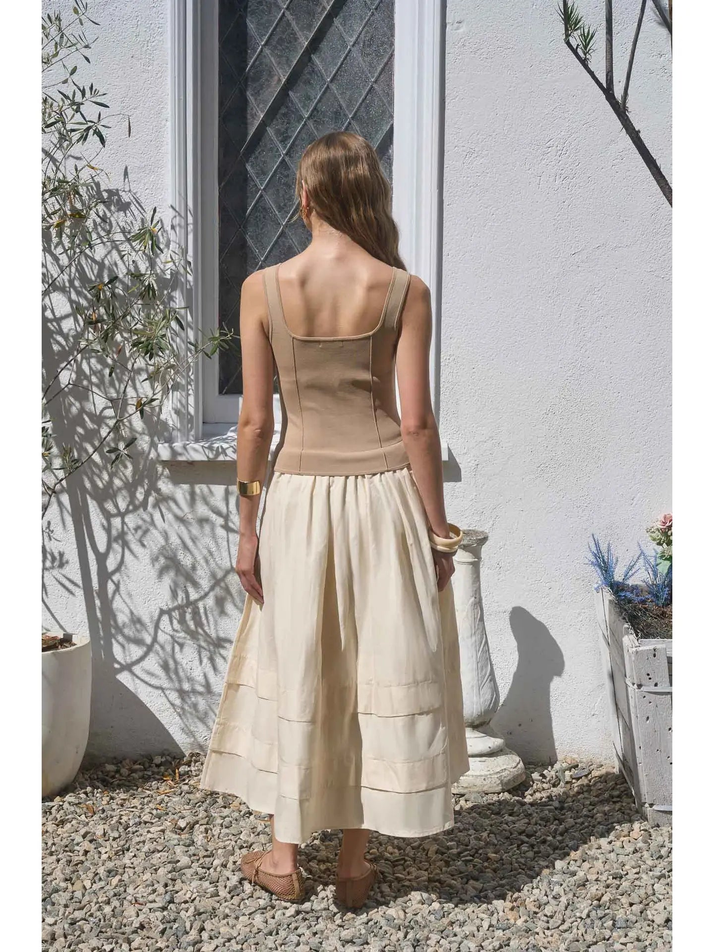 The Carolyn MIDI Dress in Khaki epitomizes a harmonious blend of sophistication and artistry. Its sleeveless silhouette gracefully embraces the body, while the delicate interplay of a knit top and woven skirt creates an exquisite texture. Thoughtfully designed with non-functional buttons, this piece transcends mere attire, becoming a canvas for effortless elegance. Lined for comfort, it invites the wearer into a world where fashion and art converge, offering a statement of refined taste.