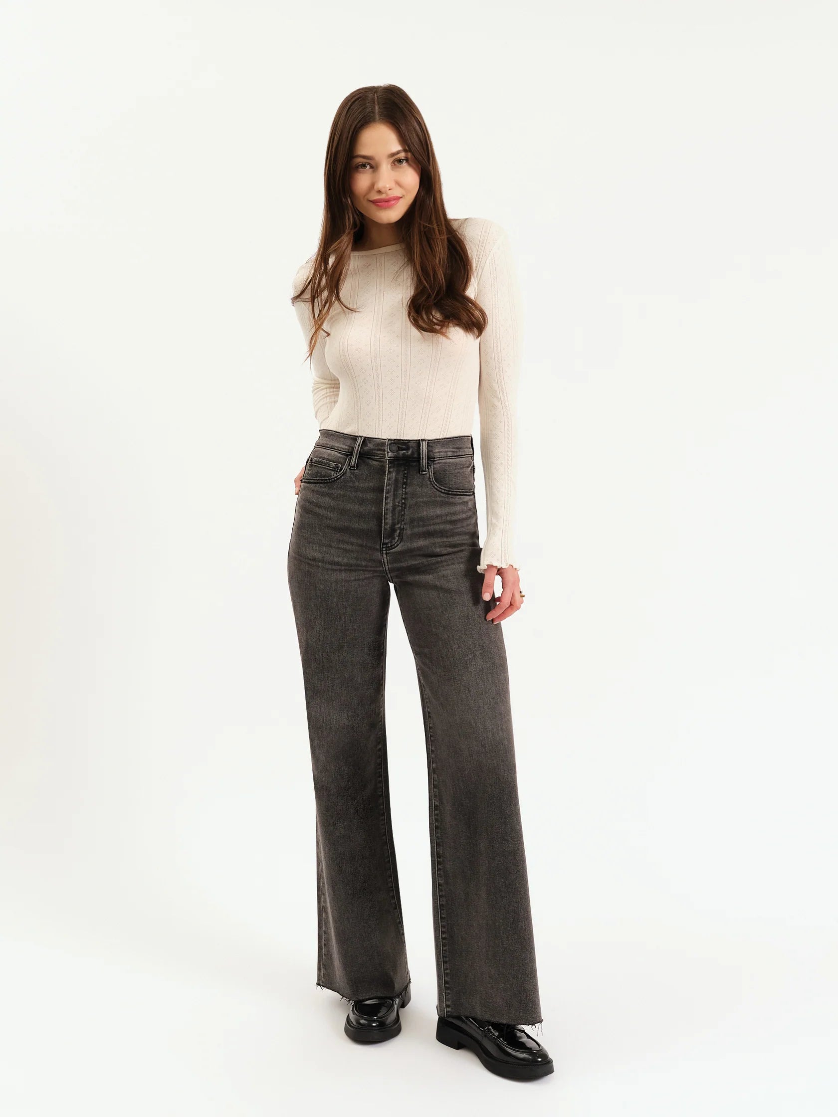 The Far Out in Milky Way is a high rise wide leg jean in a vintage-inspired faded black wash. This reliably flattering pair features a waist-cinching high rise and dramatic wide legs.