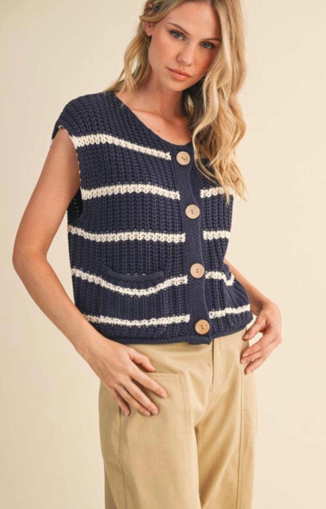 Expertly crafted, the Lenny Sweater Vest in navy boasts a stylish ivory stripe design with front pockets and button details. Versatile and perfect for any season, this vest adds a touch of sophistication to any outfit.