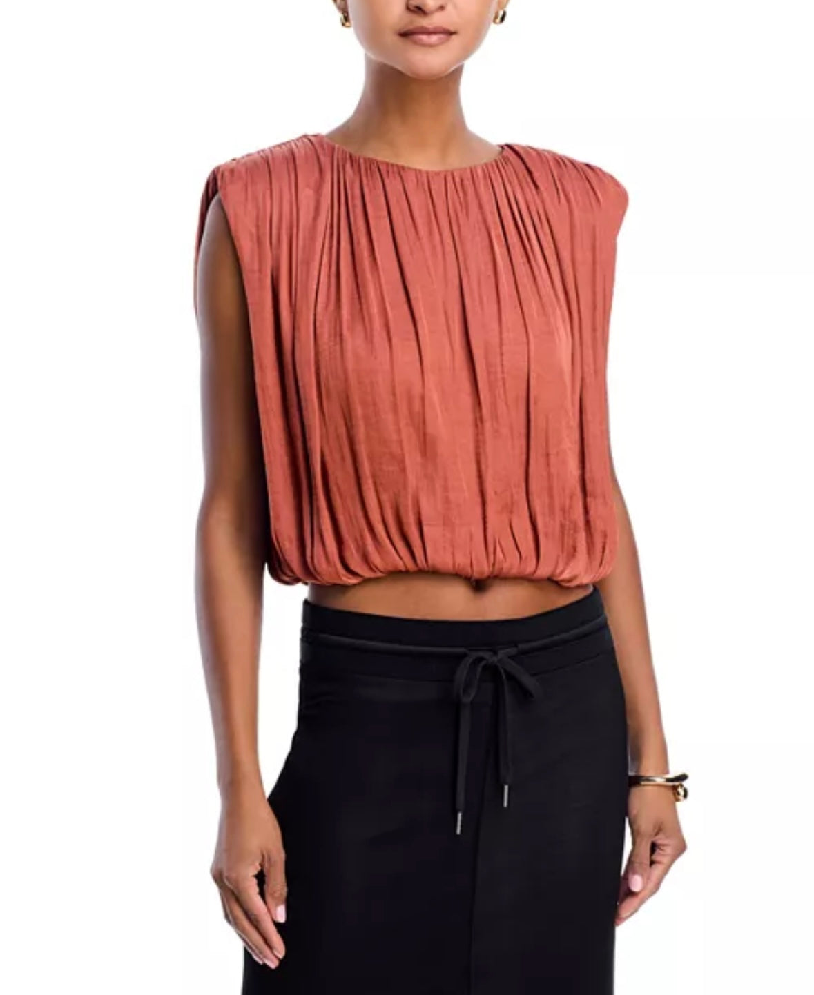 The Milana Top in Copper is a versatile addition to any wardrobe. Its round neck and sleeveless design create a timeless look, while the keyhole back button closure adds a touch of elegance. The pleated detailing adds texture and interest to this classic piece. Perfect for any occasion.