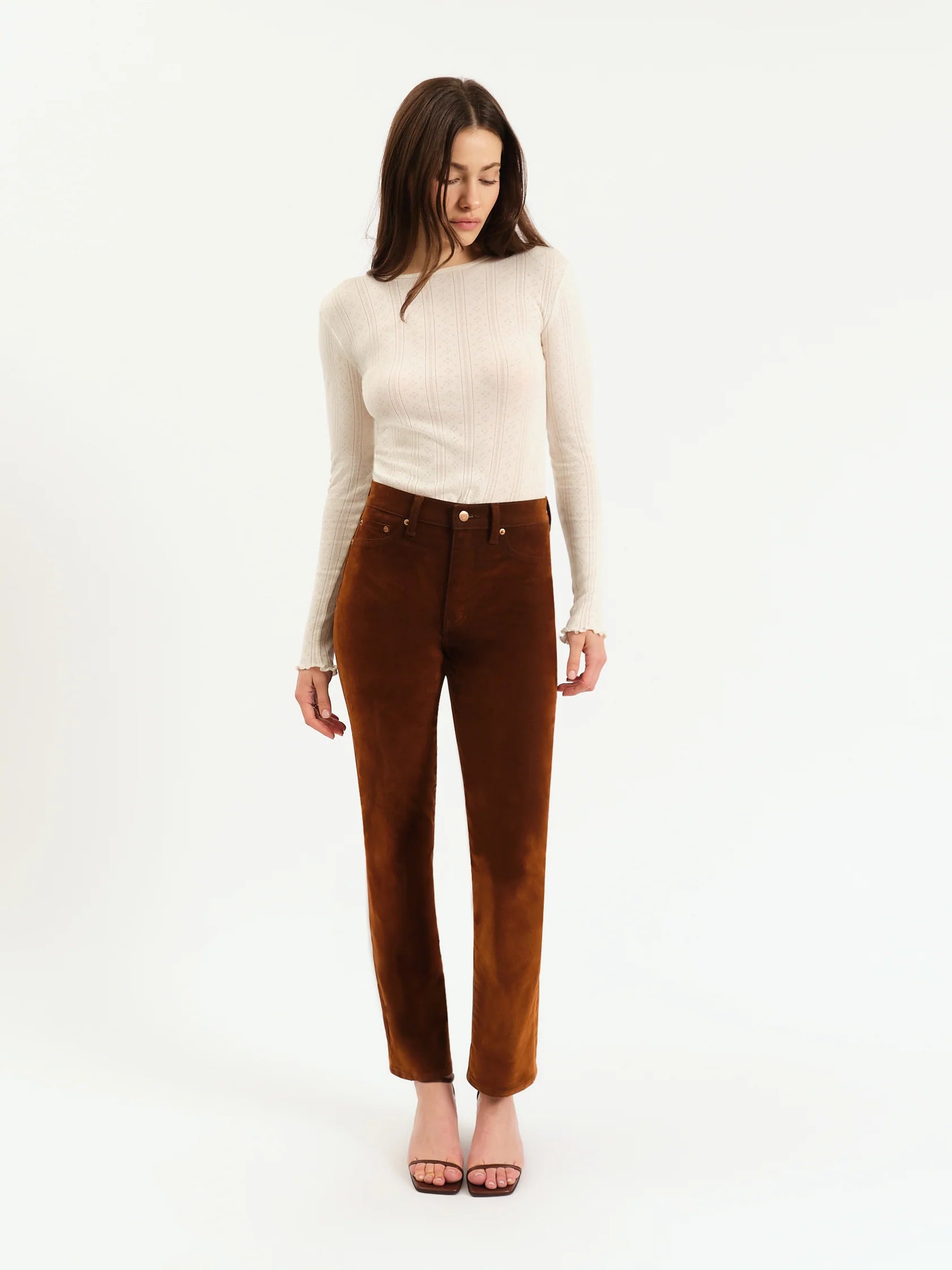 The Smarty Pants in Cognac is a high rise slim straight in a a soft, flocked denim. Its close fit, clean hems, and chic velveteen finish make it the perfect polished pair.