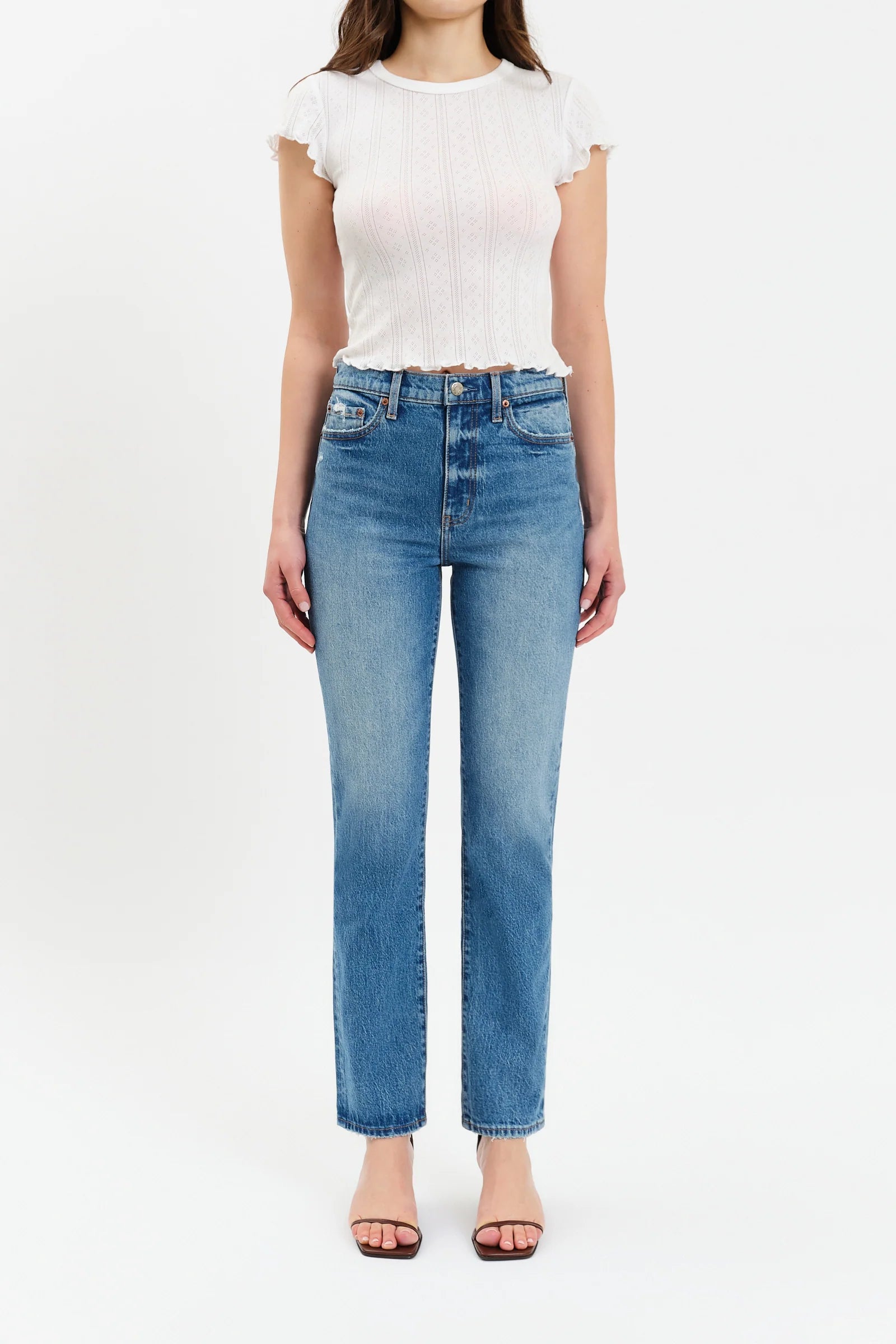 The Smarty Pants in Alter Ego is a high rise slim straight in a blue wash. Its close fit, clean hems, and sophisticated wash make it the perfect polished pair for your day-to-day. Constructed from our Tough Love fabric, this pair is mostly rigid but yields to your body in all the right ways.