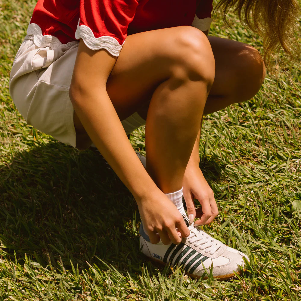 Meet the Stevie sneaker in dark green - where vintage charm meets bold design. Featuring deep green textured stripes, soft beige suede overlays, and a striking blue heel tab with a yellow accent, this sneaker is all about standout details. Made with premium faux leather and a durable gum sole, it's the perfect blend of retro style and everyday versatility.